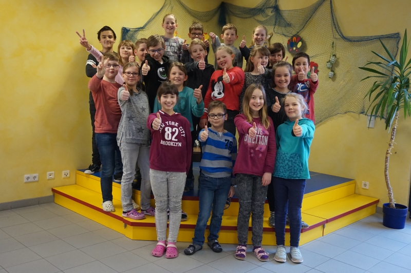 Das dritte Schuljahr ist für uns vor allem durch den Umzug in die obere Etage – zu den Großen – etwas ganz Besonderes. Endlich können wir auch den benachbarten Computerraum öfter nutzen. In Mathematik rechnen wir im Zahlenraum bis 1000 und in Deutsch entstehen nun immer längere Geschichten. Sogar Klassenarbeiten schreiben wir jetzt – wir sind nun eben fast erwachsen… Wir lesen viel und nehmen zum ersten Mal am Vorlesewettbewerb der Schule und an der Mathematik-Olympiade teil. Auch in sportlicher Hinsicht werden die Herausforderungen für uns immer größer.